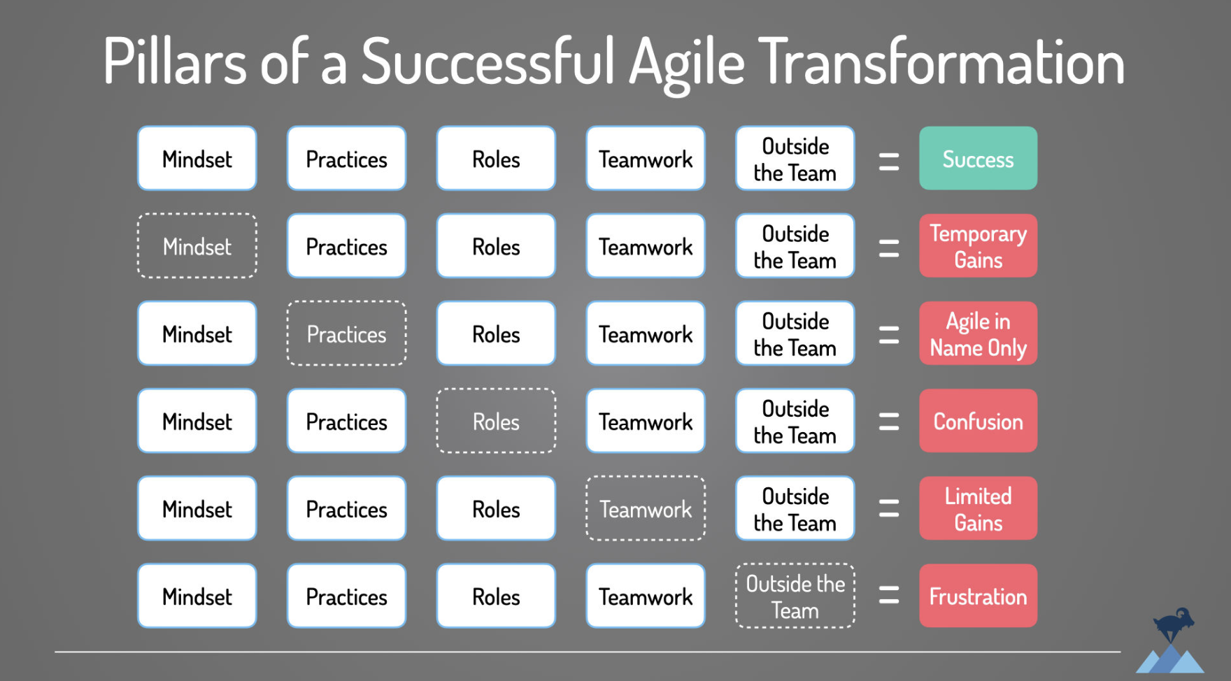 Yeah, I'll give you a couple of links that you can put in the, in the show notes. And certainly, I mean, this is, um, kind of what we do at Mount and Goat Software. So you can contact us at mount and goatsoftware.com, but I'll give you a couple of links in the show notes. have a, um, a good diagram I can give you that you can link that shows, um, what happens if one of the pillars is missing. For example, if mindset is missing, you end up with kind of temporary gains, right? You know, cause you're not really going to be truly agile.
