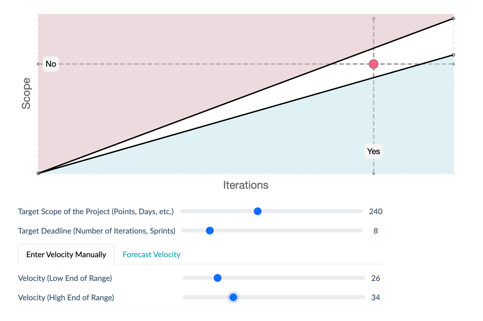 Suppose a team has been asked to complete 240 story points within 8 iterations (marked with a red dot in the image below). The team estimates that its future velocity will fall in the range of 26–34. The numbers (26 and 34) are used to draw the lines showing how much can be delivered.