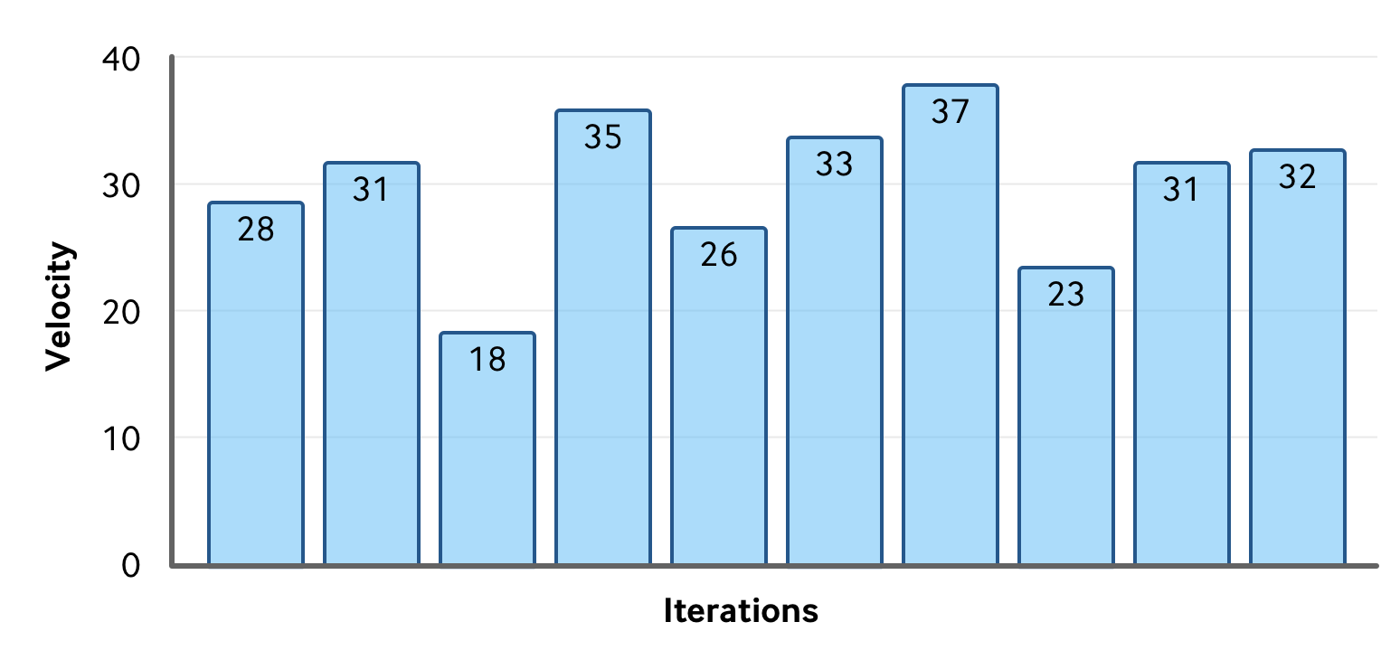 The team in this chart has an average velocity of 29. But in the past, their velocity has been as low as 18 and as high as 37. If they were asked to forecast their velocity in the next sprint, their honest answer would be anywhere from 18 to 37.