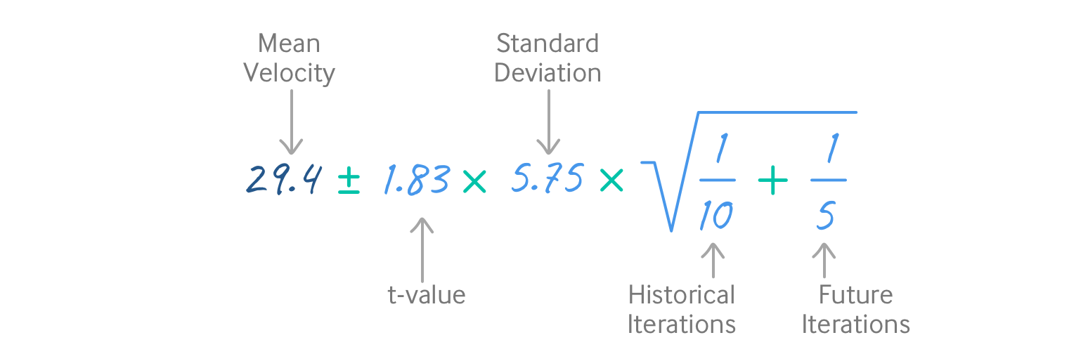 We start with the team’s average, or mean, velocity. We then add and subtract some amount to that, and that’s everything to the right of the plus-minus symbol. Here’s what that formula means.